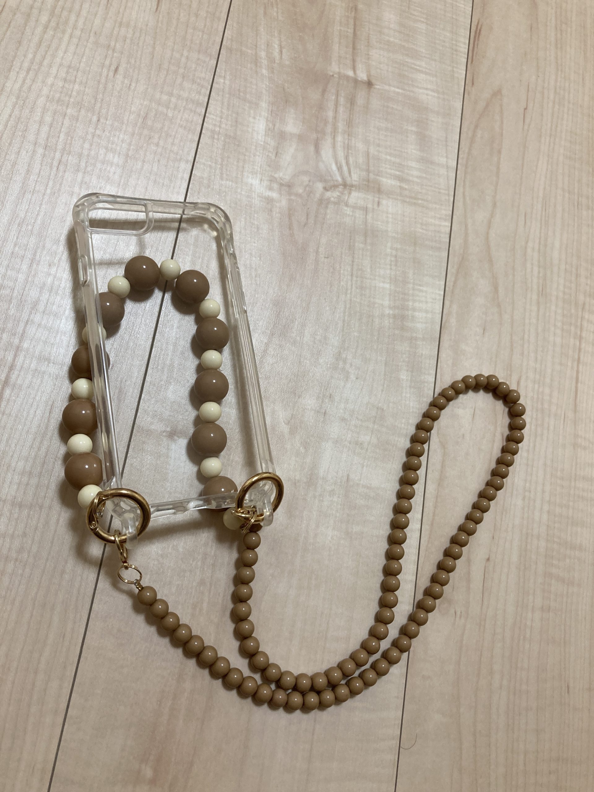 斜めがけは出来ませんが肩から下げるのと、ハンドバッグのように持てるウッドパーツの取手次のケースです。スマホだけでお出かけの時に使いやすいです。