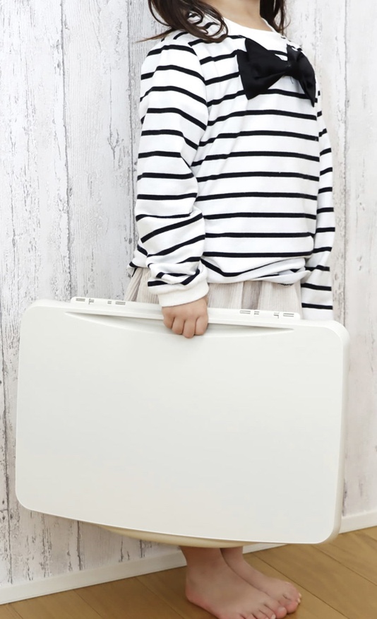 中に落書き帳や色鉛筆も入れておけるから子供達がお絵描きしたりしてましたが、下の子男の子が乗っかってジャンプしてバキバキってすごい音がして…割とすぐ壊してしまいましたが、数ヶ月は使いました(爆笑)折り畳みできるし、風邪ひいて食事をベッドに持って行く時に使ったりも出来るし便利でした。 欲を言えば子供が乗っかっても割れない位の強度、足をプラでなく、丈夫な素材にするとか、折り畳みから開く時かやりずらいので、そのへんか、改善してくれたら、💮はなまるですね