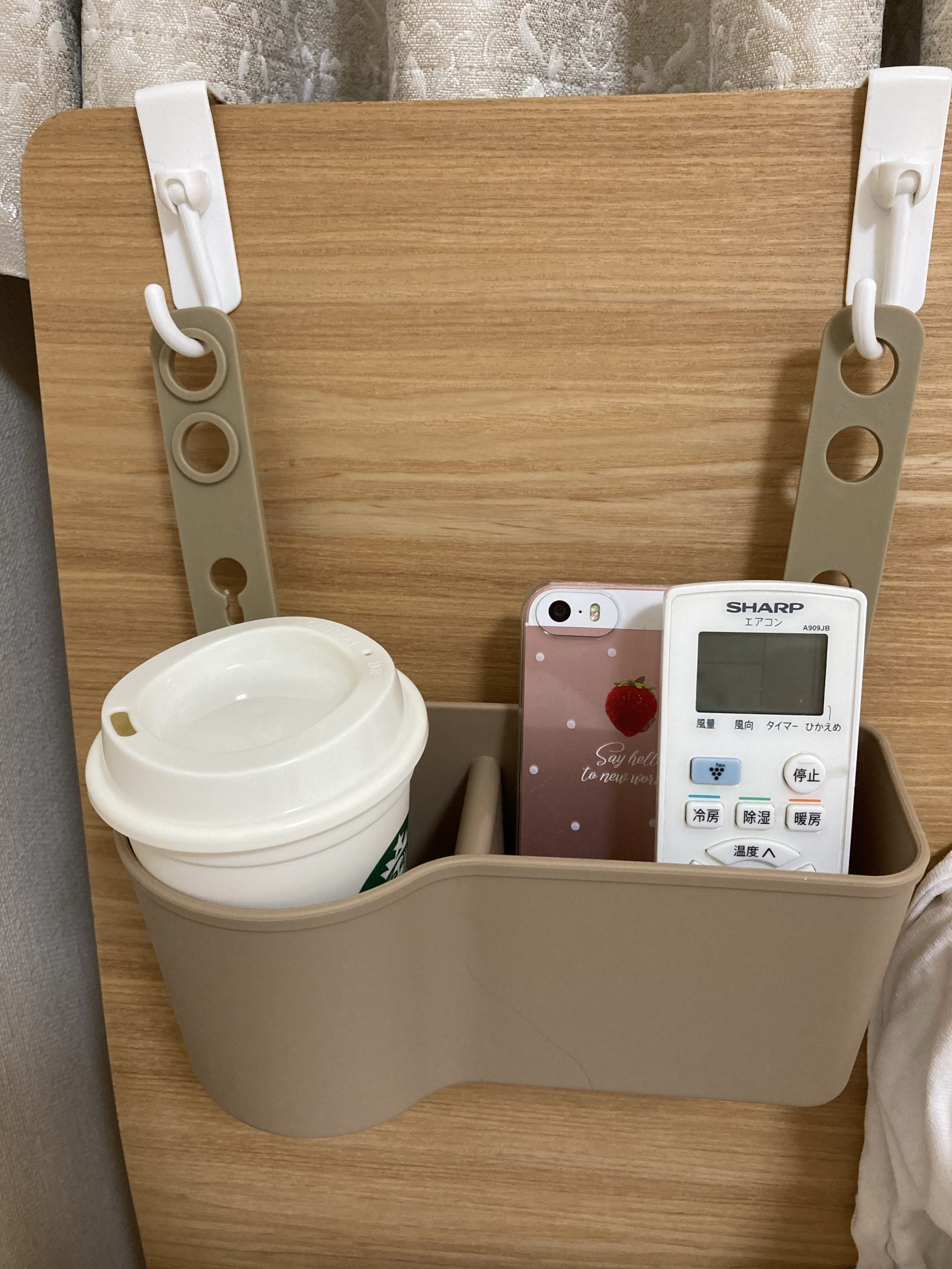 左部分はドリンクを収納、隣の部分は携帯スマホなど入れると便利そうです。お出かけする時には持って行く感じにしようかと思い、今はベットのベッドボードに取り付けて、リモコンや携帯を入れたりしています。なかなか使える。ベットでも便利です✨真夏はドリンクもベッドに常備できそう✨
