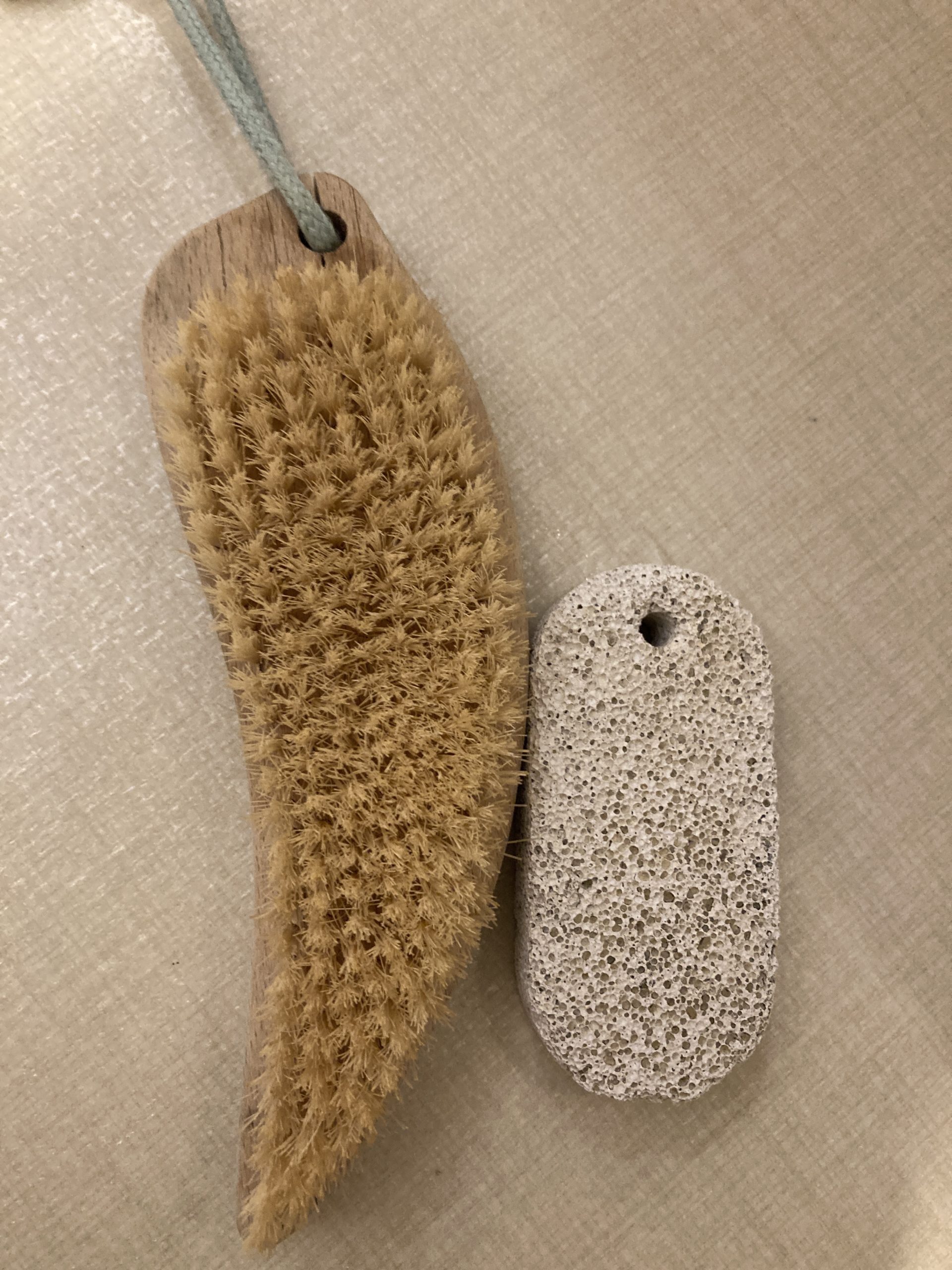 フットブラシは天然木ヒノキのもので、マリークワントで昔から愛用してます。豚毛でしっかり洗ってくれるしマッサージ効果もあり気持ちが良いです。右は100均で購入した軽石。結局これが一番ツルッツルになる気がします。