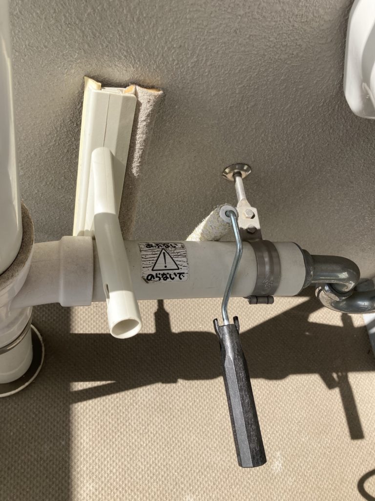 保管はベランダのスラップシンクのある、柱にかけてます。左隣は無印の窓掃除用のスクレーパー