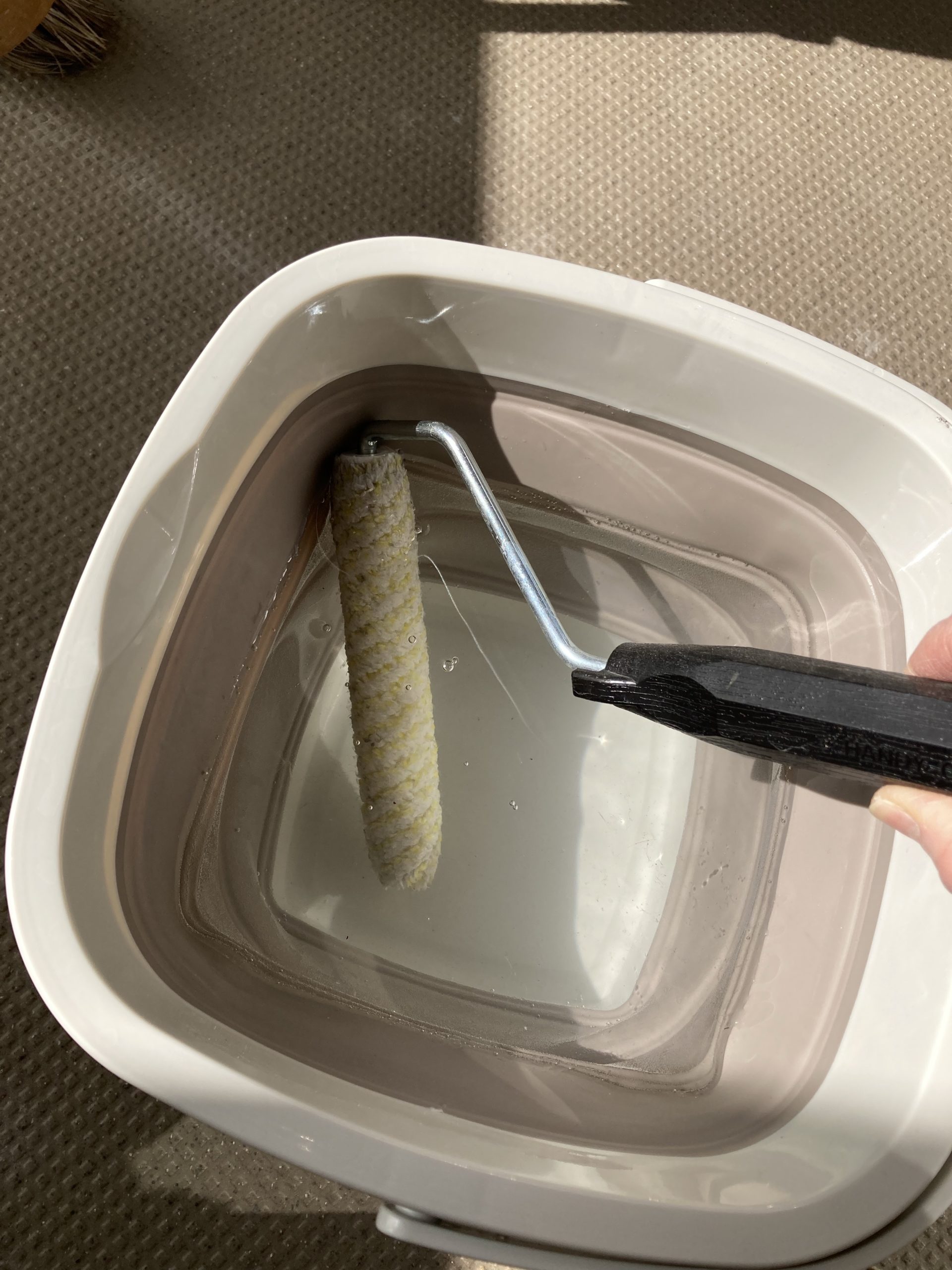 バケツの水に中性洗剤を入れて混ぜてローラーによくつけます。